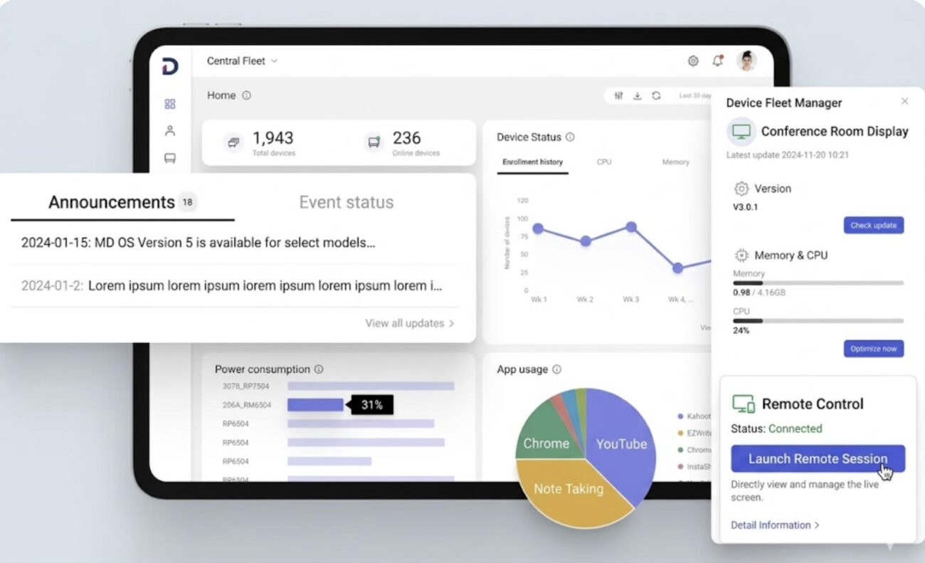 Centrally manage all campus displays—push updates, schedule power cycles, and broadcast emergency alerts remotely.