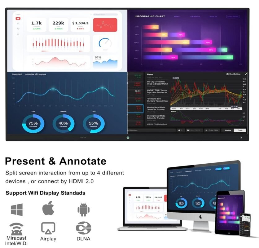 All-In-One Collaboration: Wireless screen sharing (up to 9 devices), built-in 4K camera, array mic, and high-power speakers.