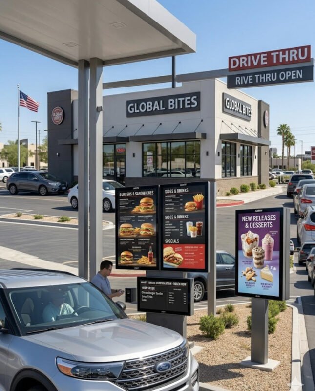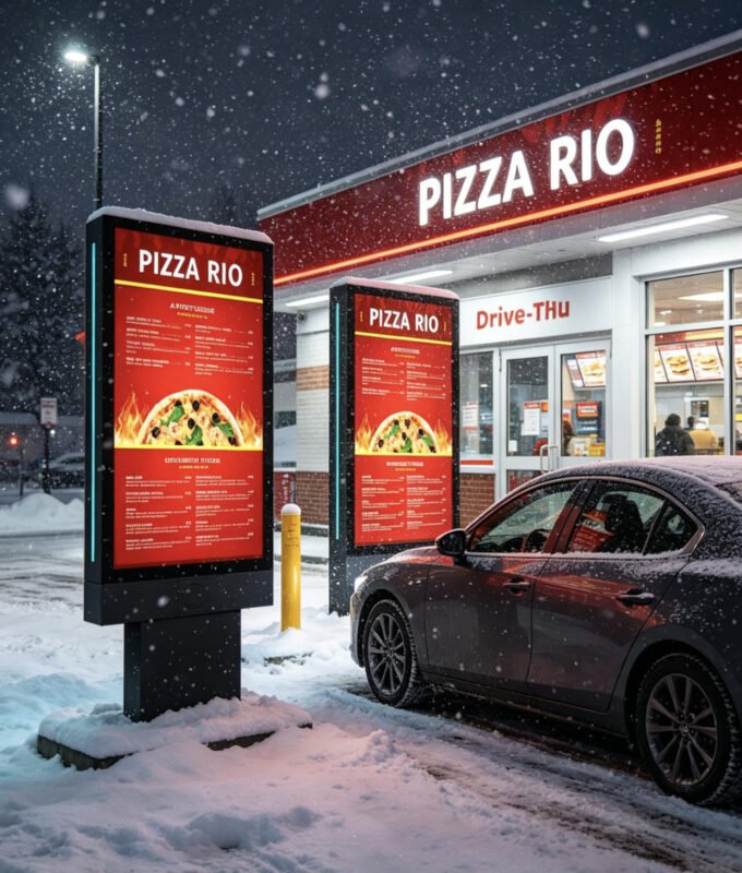 Display Sizes: 55″ and 65″ (Optimized for Drive-Thru viewing distances).