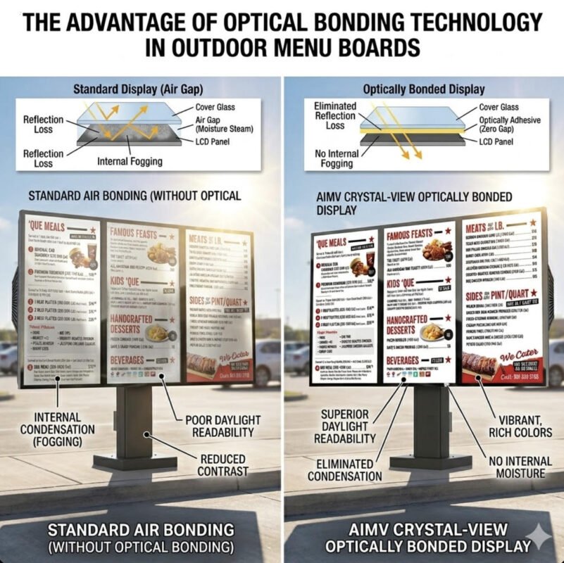 Speed up service and boost your ticket sizes with AIMV’s industry-leading 55″ and 65″ outdoor drive thru digital signage. Engineered specifically for the demanding environments of Quick Service Restaurants (QSR) and coffee chains, these commercial-grade displays ensure your menu looks appetizing, readable, and vibrant in any weather condition.