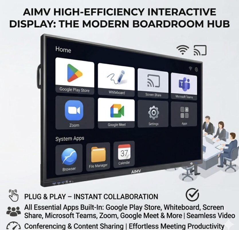 The AIMV interactive flat panel eliminates the need for external devices, letting you host seamless hybrid meetings directly on your favorite platforms (Microsoft Teams, Zoom, Google Meet) with its integrated 4K UHD camera, 8-microphone array, and premium audio system. Experience true pen-on-paper feel with pressure-sensitive stylus, 40-point multi-touch, and advanced palm rejection technology. AIMV interactive display delivers exceptional visuals, effortless connectivity, and up to 20% energy efficiency compared to standard displays.