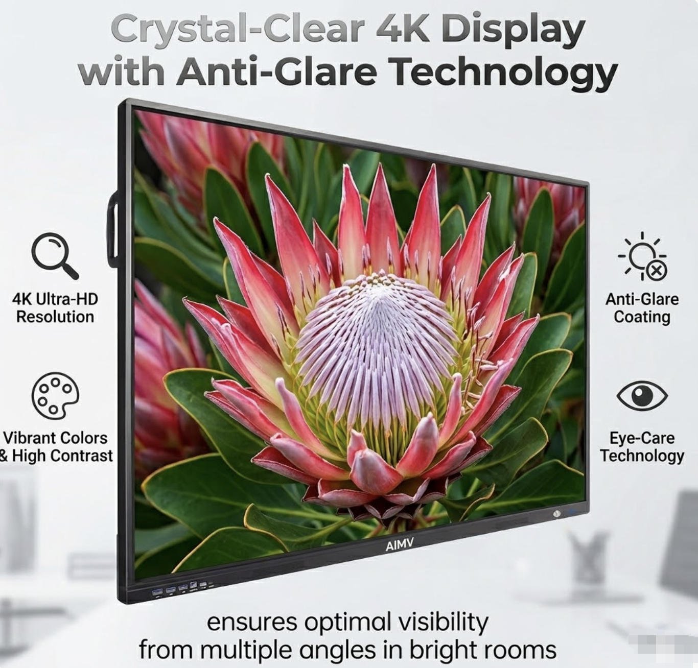 4K UHD & Anti-Glare Display: 3840×2160 resolution, 178° wide viewing angle, anti-glare & scratch-resistant glass for clear visibility in bright classrooms.