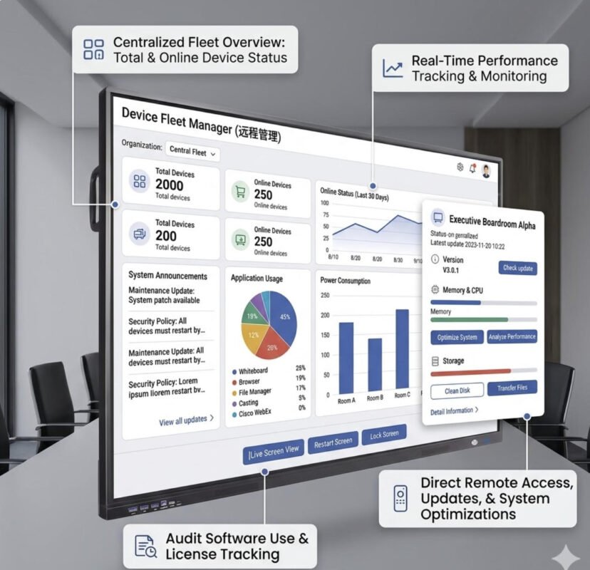 Designed with IT administrators in mind. Take complete control of your interactive displays across the entire organization. Our intuitive dashboard allows you to monitor real-time power consumption, check CPU and memory usage, push OTA updates, and launch instant remote control sessions to provide technical support—all from one centralized location.