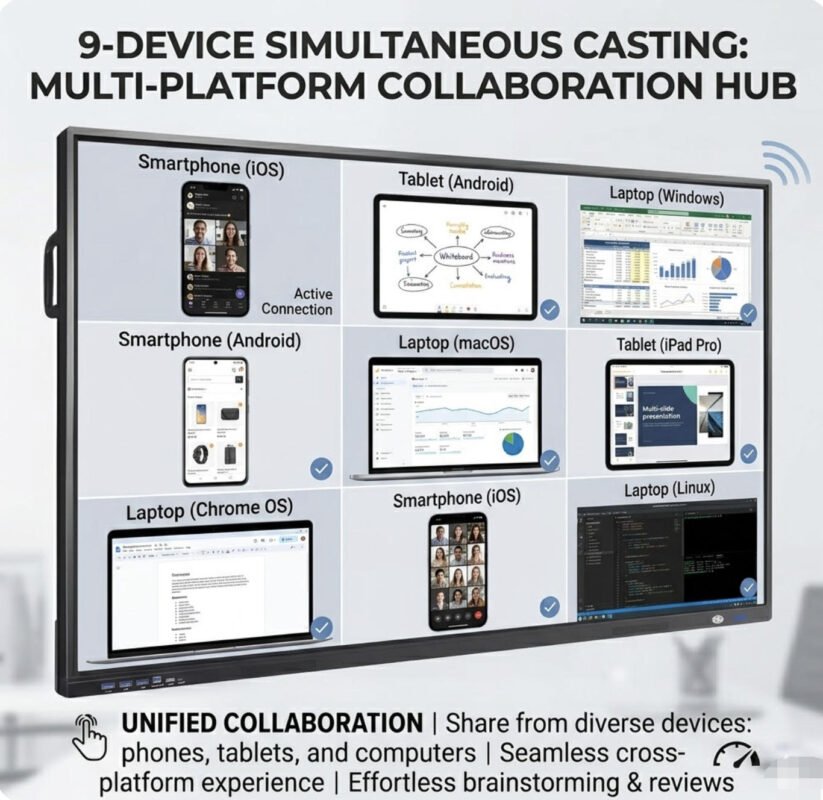- All-In-One Collaboration: Wireless screen sharing (up to 9 devices)