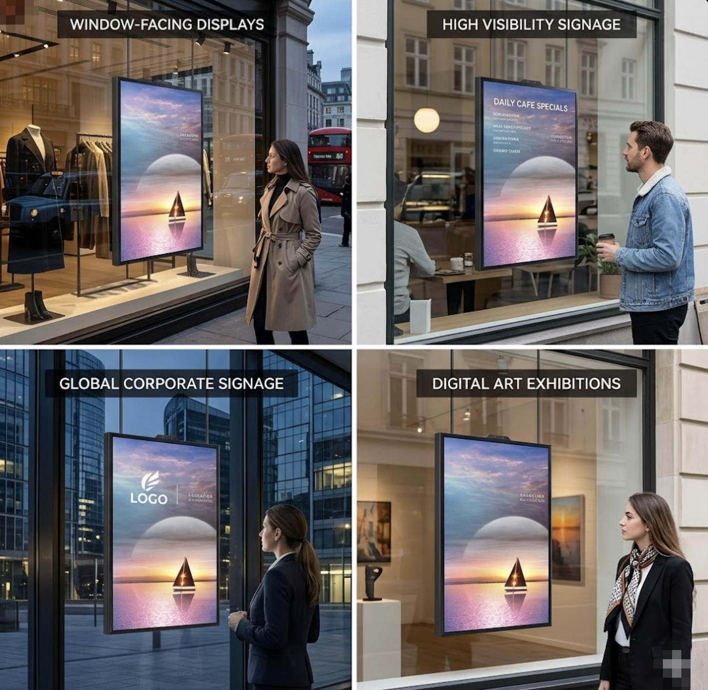 Turn your retail windows into powerful marketing tools. Designed specifically for outward-facing environments, our premium window facing displays (available from 32″ to 86″) guarantee that your promotional content cuts through glaring ambient light. Whether it’s a bustling high street or a sun-drenched auto dealership, these screens ensure your brand is seen clearly by every passerby.