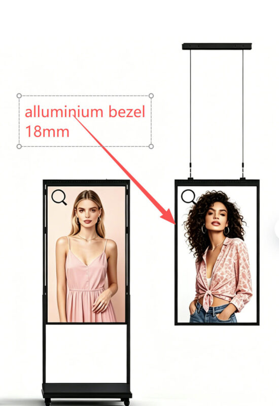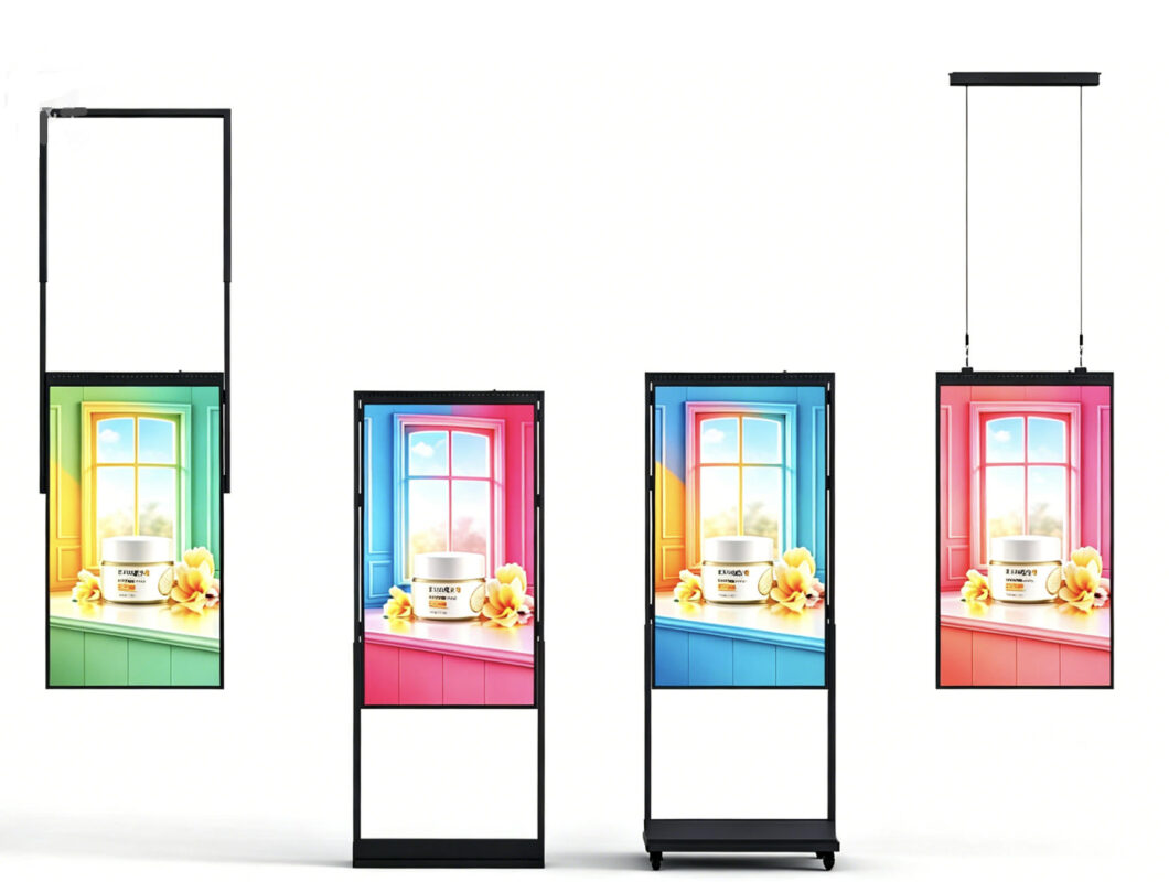 Our window facing displays offer unparalleled installation flexibility with both ceiling mount and floor standing options. The ceiling mount solution is perfect for saving space and creating a floating, modern look, while the floor standing option provides stability and easy relocation. This versatility allows you to effortlessly integrate our window facing displays into any architectural design or space requirement, ensuring optimal visibility and impact.
