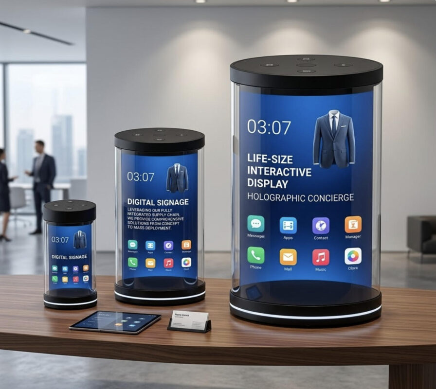 Bring your AI avatars to life. Explore our 3D holographic displays from 5.5″ (battery-powered) to human-sized 75″. Open Android OS for custom AI software.