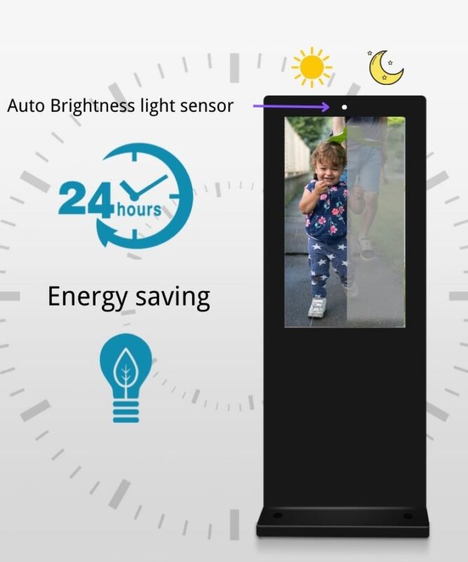 A freestanding unit must withstand ground-level environmental hazards. Our IP65 outdoor display kiosk features a tightly sealed, vandal-resistant galvanized steel enclosure. This fully outdoor waterproof design guarantees total protection against heavy rain, snow, dust, and direct water jets, ensuring your freestanding outdoor signage remains safe and operational in the most severe weather conditions.