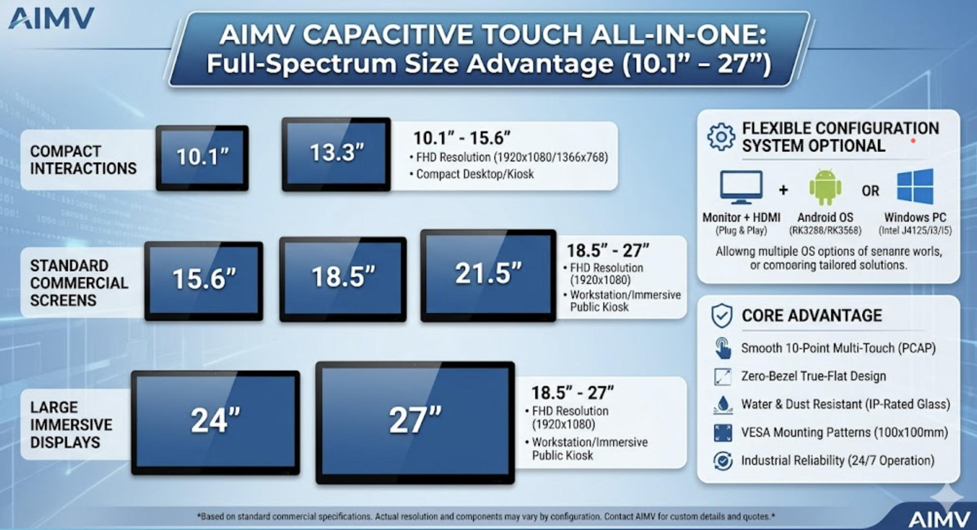 AIMV full-series 10.1/13.3/15.6/18.5/21.5/24/27 inch PCAP touch monitor and all-in-one display with high-precision multi-touch, flexible system support including HDMI input, Android and PC system, ideal for commercial, industrial, POS, self-service and office applications.